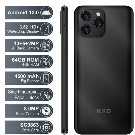 KXD A08 4G Smartphone 4GB RAM 64GB ROM 6.52 Inch Android 12 Cellphone Octa Core Mobile Phone 4500mAh 13MP Rear Camera Dual SIM
